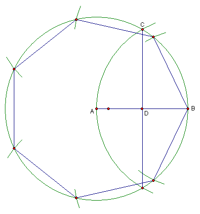 4. Where that line segment intersects AB, put a point D. Using CD as radius as shown, draw an arc interecting the circle in two points. (Two seperate arcs shown).