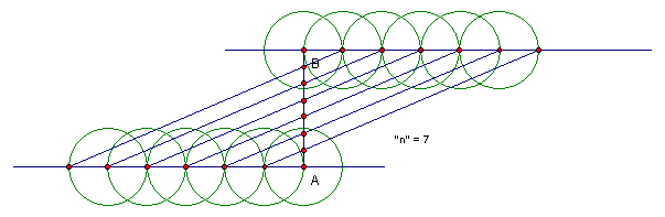 To divide a line segment by AB, draw two perpendicular lines at B and A. Draw circles with centers A and B with the same radius. These are the first circles that you have drawn. Continue drawing circles as shown until the number of circles on both sides equals "n". Connect the second vertex to the other side as shown. Draw lines parallel to each other in the same manner. Where these lines intersect AB, put points. These points divide AB into "n" parts.