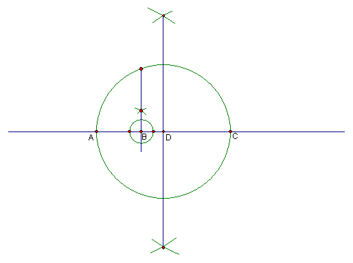 To construct the geometric mean of two segments AB and BC, draw them together on the same line as shown and find the bisector of AC. This can be done with a perpendicular bisector as shown, or with a compass. Call the bisector of AC "D". Draw a circle with radius DA or DC. Where segments AB and BC meet at B, draw a perpendicular through B perpenndicular to AC. Where it intersects the circle put a point. B to this point is the geometric mean between AB and BC.