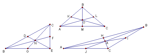The medians of any triangle (a line segment from a vertex to the opposite side that divides the opposite side into two equal segments meet in a point that is two thirds the distance. Ex: if NF equals 1, then BN equals 2.