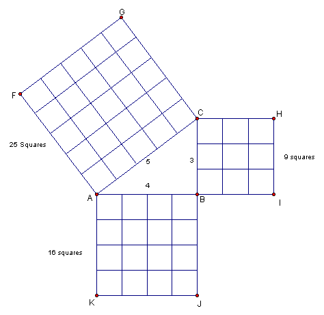 If triangle ABC is a right triangle, then the measure of the two shorter sides (called legs) squared and added together equals the square of the measure of the hypotenuse. (a squared + b squared = c squared).
