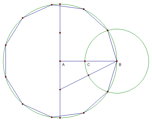 To make an 11-gon, draw a diameter (the vertical line segment) and construct a perpendicular radius(AB). Draw a line segment from the midpoint to B (the longest diagonal line in the figure). Construct the midpoint of that line segment and use that point to point B as your circle radius. Move the compass around the circle, marking off this length. IF you've worked very carefully, the compass should meet point B with a very tiny gap. (This construction is not perfect).