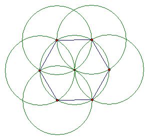 To construct a hexagon, draw a circle. Next, (using the same compass setting), select a random point on the circle (this will later be a vertex of the finished polygon) and draw another circle. This circle should, if drawn correctly, intersect the outside of the circle in two places and just touch the center of the first circle. In a place where the second circle crosses the first, repeat the process. Continue in this manner until you reach the beginning. Connect every point that touches the very first circle that you drew. Those line segments form a regular hexagon.