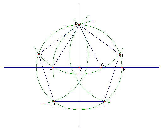 Using FD or GD as radius and F and G as centers, draw arcs intersecting the circle at D, H and I.