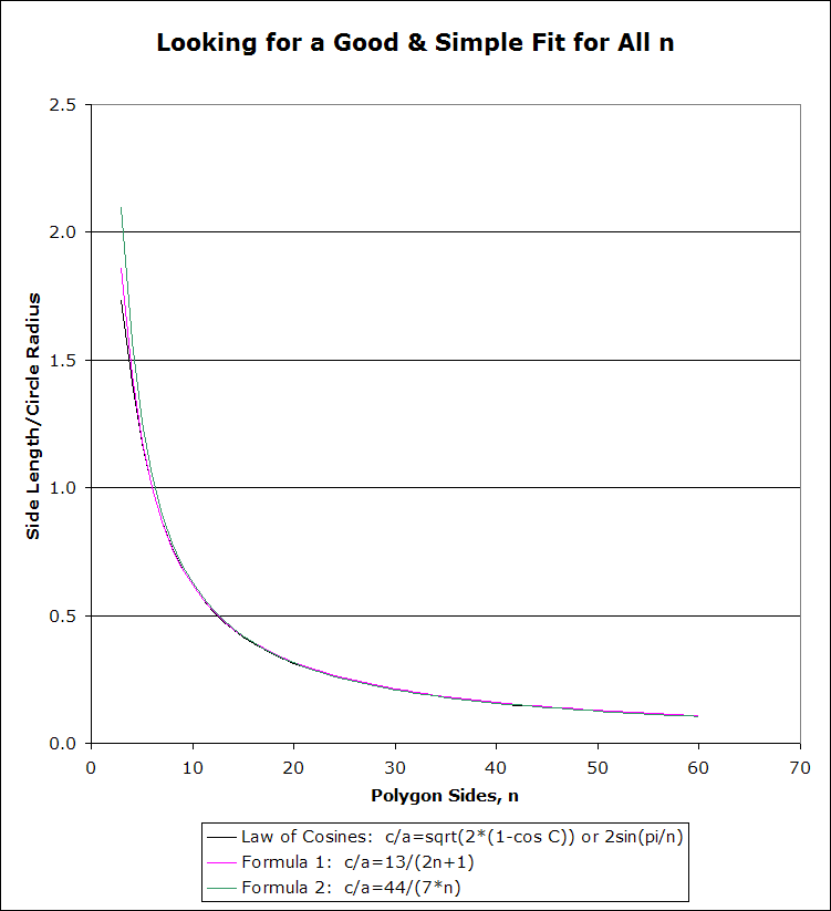 After using common exact constructions for n=3,4, and 5, one might reasonably continue with the Formula 1 approximation for n=6 through 14, and Formula 2 for higher n. However, Russ suggests that, for a highly accurate polygon of small n, one could merely construct a polygon with a convenient integer multiple of n sides, but only connect a corresponding fraction of the vertices. Thus we have a procedure that covers polygons of all n.
