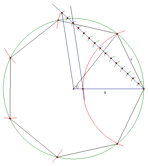 In the case of Ian’s “fraction of the radius” procedure, both a and b are the radius of the circle, and c represents the length of one side of the polygon. C is the central angle opposite c, and for a regular polygon of n sides is equal to 360/n, or in radians 2π/n.